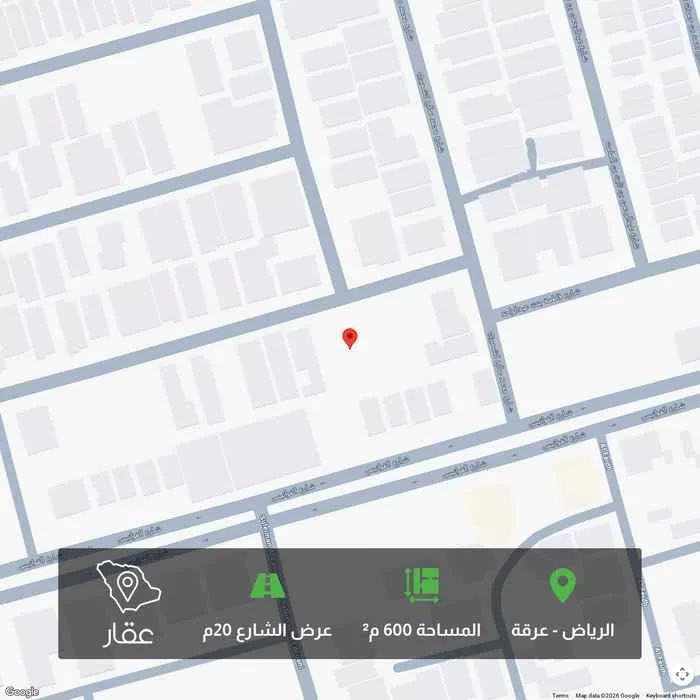 View on Aqarفرصه عقاريه ارض سكنية للبيع الموقع: عرقه - الراشد الجنوبي المساحة: 600 م الواجهة: شمال شارع : 20 م * عمق 40 يتميز الموقع بقربها من جامع الطيار وكارفور وكذلك من حي السفارات ومن جميع الاماكن السياحية وا...