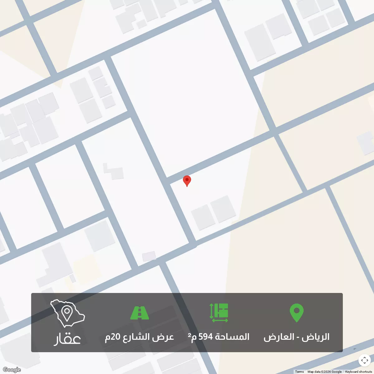 View on Aqarللبيع حي العارض مخطط 2357 قطعه رقم 156/8 زاوية مساحة 594م الاطوال 21x28 شارع 20 شمالي بطول 21م شارع 20 غربي بطول 28.27م على السوم