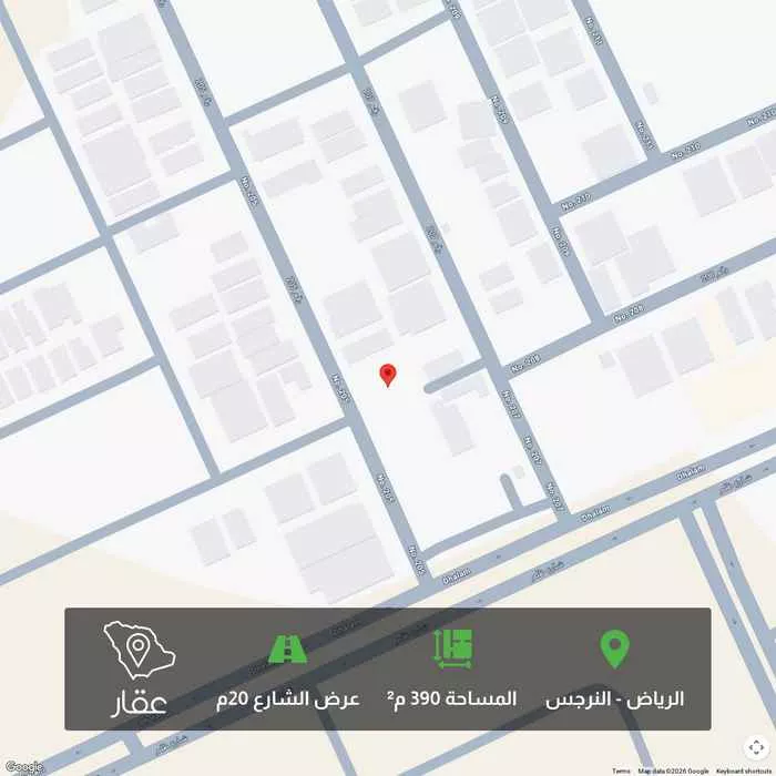 View on Aqarارض في حي النرجس شمال الرياض عليها رهن للبنكً ٩٠٠ الف الرهن ٩٠٠ الف وفي حال السداد المبكر ٧٠٠ الف رقم المخطط : ٣٧٣٨ النرجس / الضحيان قطعة الارض : ٤٢٠/١ المساحه : ٣٩٠ متر . الواجهة : غربي شارع ٢٠ ، ممر...