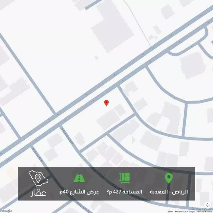 View on Aqarأرض تجارية سكنية للبيع بحي المهدية - الرياض رقم القطعة: 3160 رقم المخطط: 2566/ب المساحة: 427.5 متر مربع الواجهة: شمالية على شارع 40 متر بطول 19 متر على الشارع الغرض: تجاري + سكني موقع مميز واجهة شمالي...