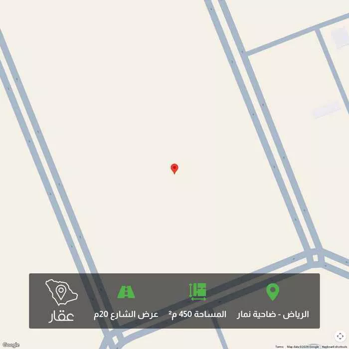 This 450 sqm land in Dahiat Namar, Riyadh is listed at 15,996 SAR, 98% below the neighborhood median of 750,000 SAR. Based on 439 comparable listings.