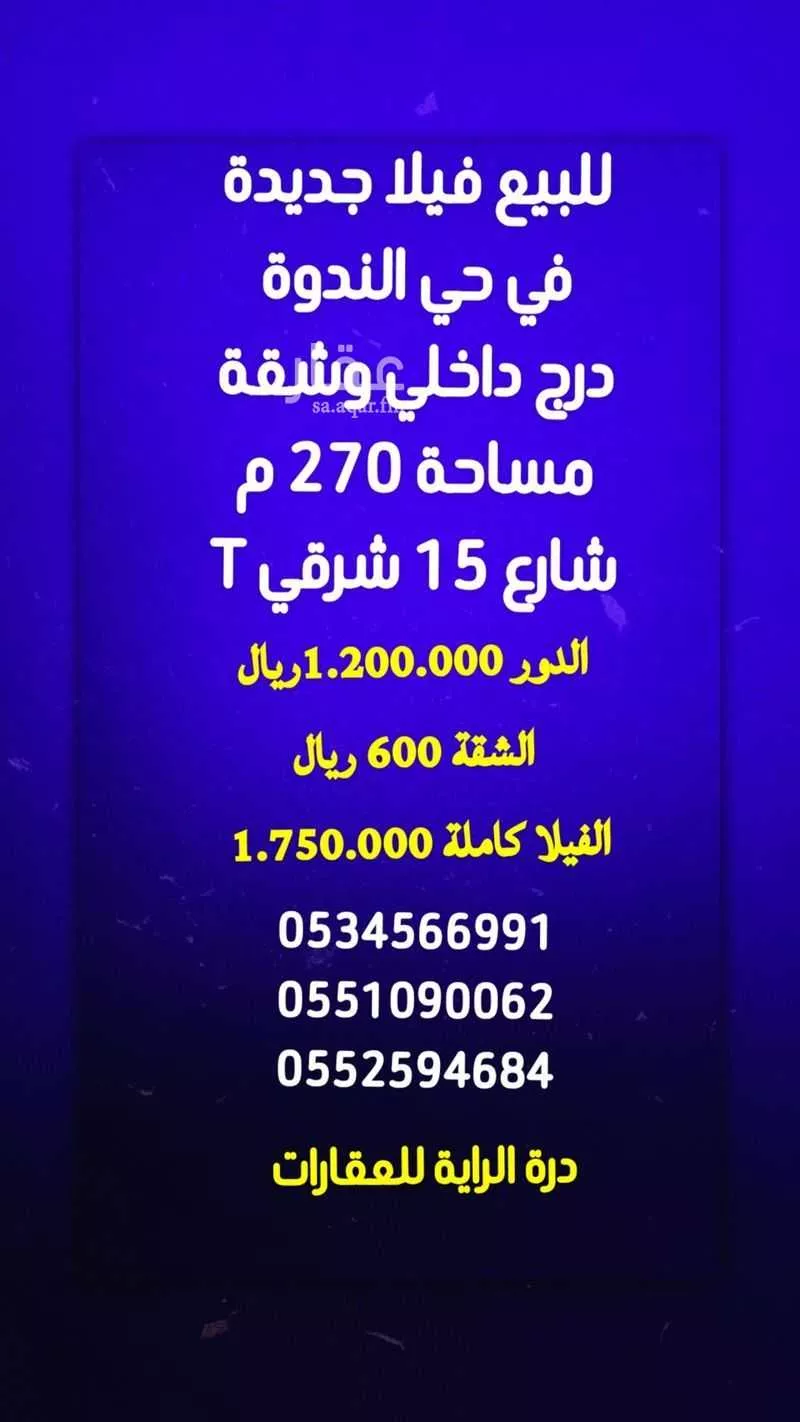 View on Aqarللبيع فيلا جديدة في مخطط جوهرة الندوة دور درج داخلي + شقة ( مجزئة ) المساحه 270 م شارع 15 الواجهة شرقية حرف T الدور لاراضي : ,,مدخل سيارة وحوش ومجلس ومقلط وصالة وغرفة مسنين ومطبخ ودورتين مياة الدور ال...