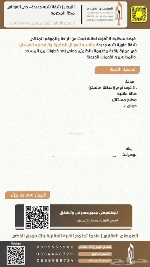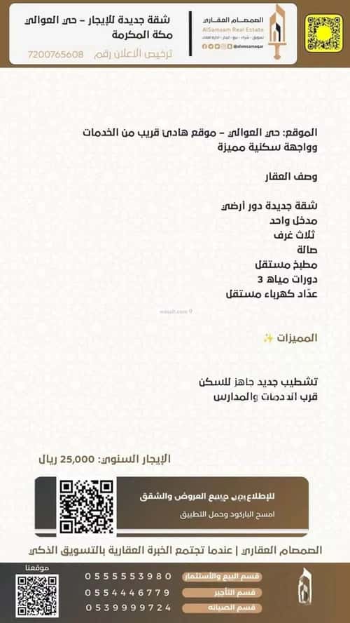 The median annual rent for Apartments in Al Awali is 30,000 SAR (2,500 SAR/month), based on 60 active listings across 13+ platforms on Darak. This is 11% above the Makkah median of 27,000 SAR/year.