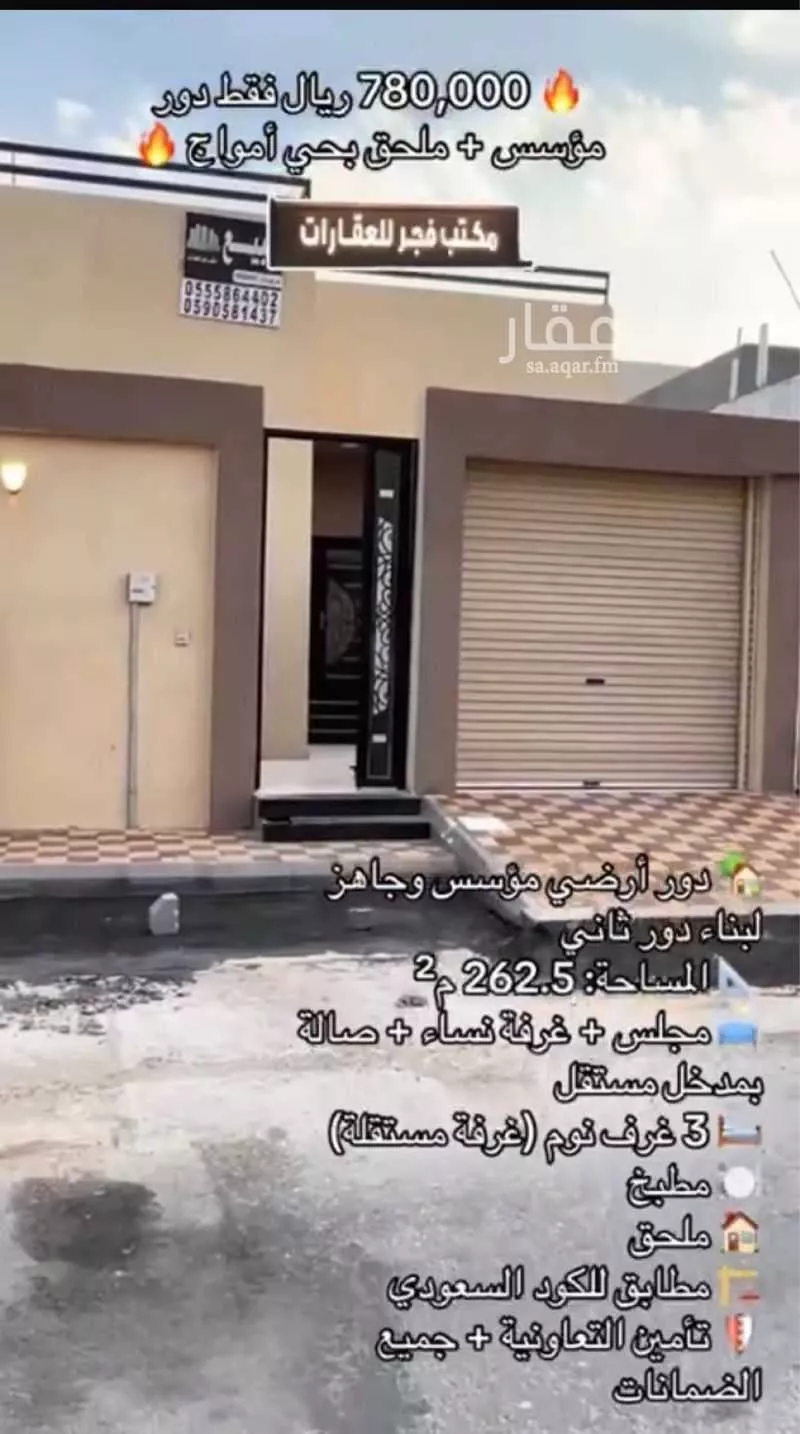 Lihat di Aqarللبيع دور أرضي حصري في حي أمواج المساحة: 262.5 م يتكون من: 3 غرف نوم + صالة + مجلس + مقلط مؤسس وجاهز لبناء أدوار مستقبلية يوجد تأمين من التعاونية مع الضمانات السعر: 780,000 ريال عن طريق البنك 750,000 ...