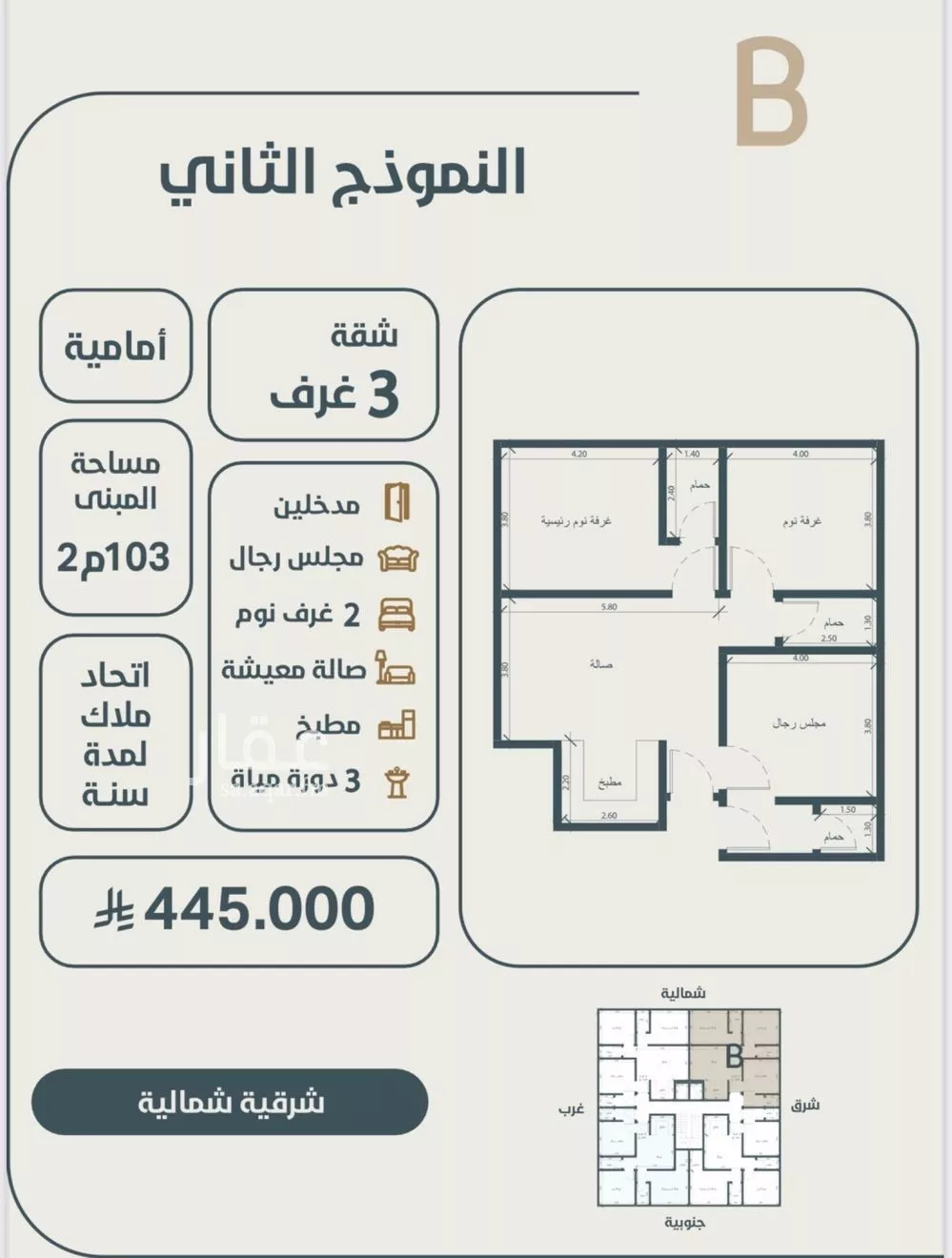 Lihat di Aqar◼ 3 غرف أمامية – 103م السعر: 445,000 ريال ──────────────