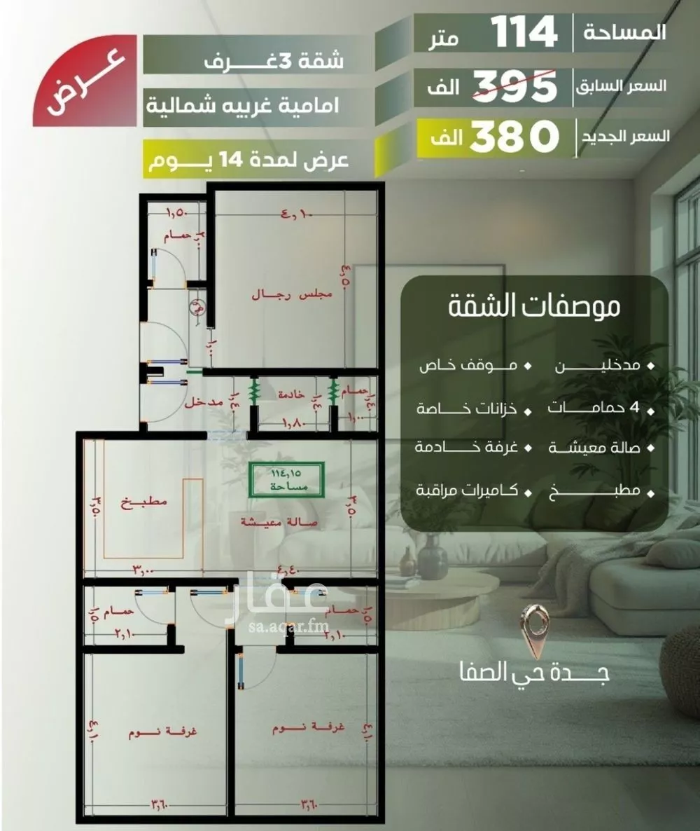 This 3BR apartment in Al Safa, Jeddah is listed at 395,000 SAR, 4% above the neighborhood median of 380,000 SAR. Based on 535 comparable listings.